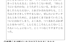 ひらがなで文章が書いてあります。この中から、「あ、い、う、え、お」の5種類のひらがなを探して〇や斜線などの印をつけます