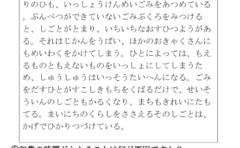 ひらがなで文章が書いてあります。この中から、「あ、い、う、え、お」の5種類のひらがなを探して〇や斜線などの印をつけます
