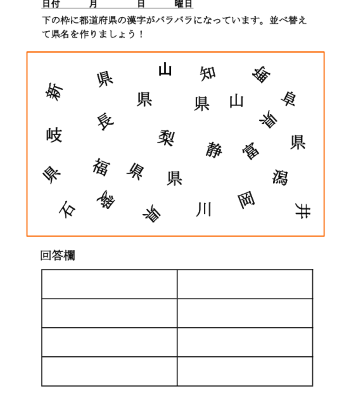 上の枠の中には都道府県の県名がバラバラに並んでいます。この中から、漢字を組み合わせて県名を作りましょう。下の回答欄に書きましょう。
