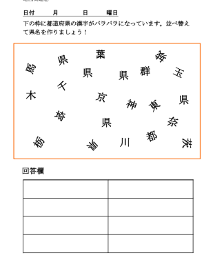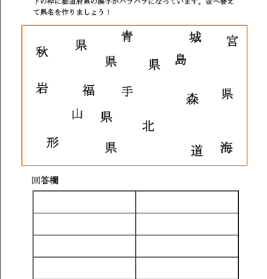 上の枠の中には都道府県の県名がバラバラに並んでいます。この中から、漢字を組み合わせて県名を作りましょう。下の回答欄に書きましょう。