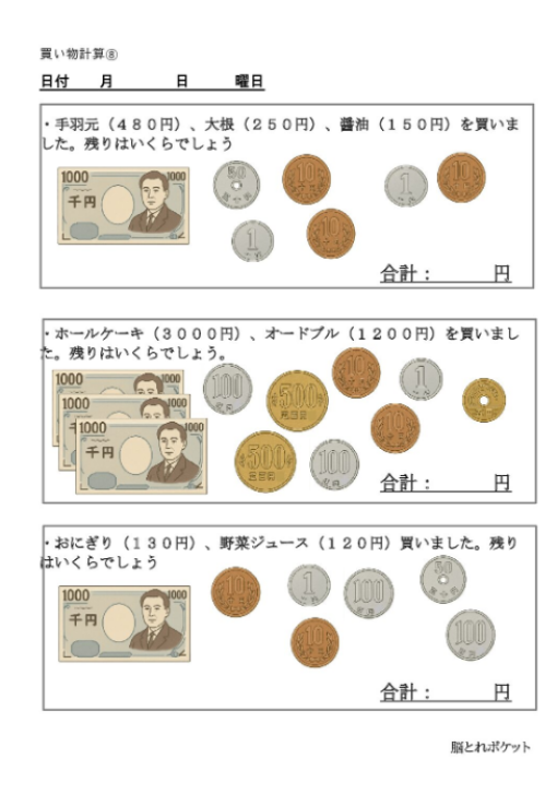 日常生活で必要になる、買い物やお金の計算の練習になります。